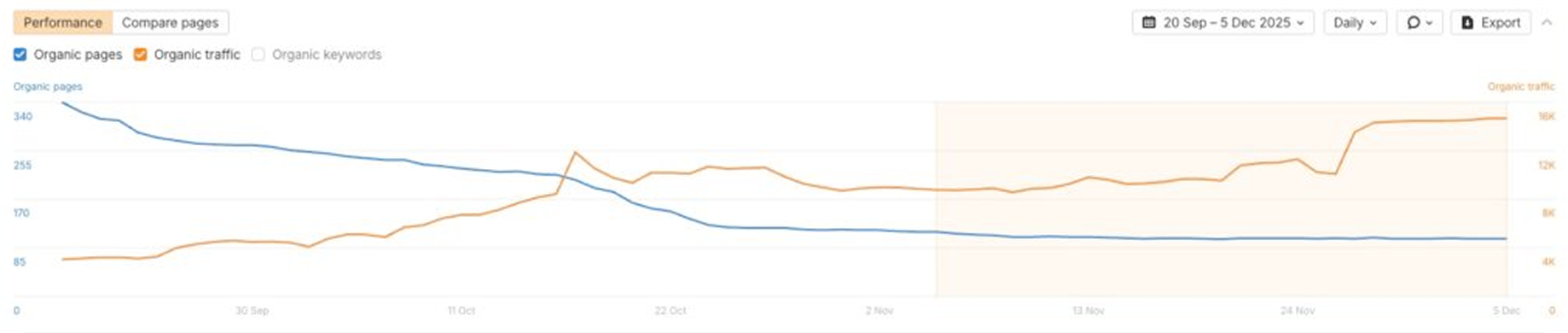 Note: Traffic value is shown using Ahrefs because it differentiates informational traffic from bottom-of-funnel, conversion-focused traffic. This provides a clearer view of the revenue potential behind the growth.